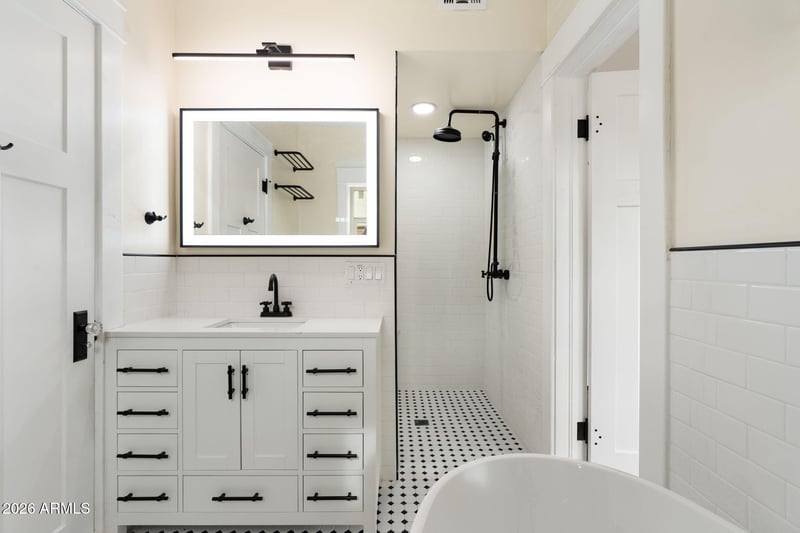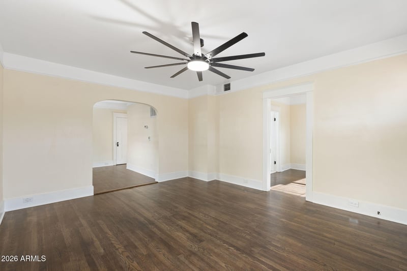 Listing details for 332 Windsor Ave, Phoenix, AZ 85004 : Built in 1920 and beautifully reimagined, 332 E Windsor blends historic Phoenix charm with extensive modern updates. The main home offers 959 sq ft, 2 bedrooms, 1.5 baths, separate living and dining spaces, and an updated kitchen featuring a movable island with breakfast bar. Improvements include new cabinetry, countertops, electrical, plumbing, windows, exterior paint, and synthetic stucco, while original hardwood floors, windowsills, crown molding, and an original built-in ironing board preserve the home's character. Thoughtful design details include 7-inch baseboards, in-floor outlets with charger plugs, glass doorknobs, illuminated kitchen cabinetry, and upgraded sinks with glass washers. FOR INFO ON THE CARRIAGE HOUSE, SEE MORE... The detached 480 sq ft carriage house offers LVP flooring, living area, full modern kitchen, bedroom, bath, laundry hookup, backyard access, and mini-split systems. Two RV gates, pavers, and a new front porch complete this standout property near downtown Phoenix, dining, shopping, sports, and entertainment.