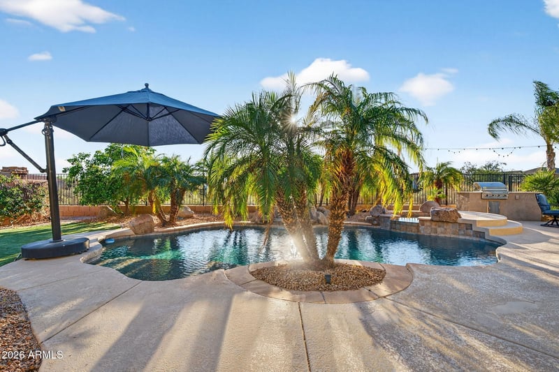 Listing details for 33310 23rd Dr, Phoenix, AZ 85085 : Entertainer's dream home on a spectacular lot backing an open desert area! The resort-style backyard features a gorgeous heated pool & spa with waterfalls, BBQ island & gas fire pit seating area ... all accented by palm trees & lush landscaping. You will feel like you are on vacation every day! Lots of artificial turf to play on - bring on the yard games! Relax with family or friends on the covered patio - complete with a large awning that goes out with the press of a remote. Dine al fresco under the string lights while enjoying the sunset. You will love the soothing sounds of the waterfall. The large baja shelf in the pool is great to relax on & the multi-colored pool & spa lights are beautiful at night. You will love the fabulous floor plan - perfect for entertaining! The spacious ... formal living & dining area features a custom bar wall sure to impress your family & friends! It includes a sink, ice maker, two separate wine/beverage refrigerators, & wine storage rack - all in handsome cabinetry with rain glass & accent lighting! Separate from this is the gorgeous kitchen open to a spacious family room. The chef in the family will love the dual wall ovens & gas cooktop! Plenty of pantry & storage space plus lots of room to work/prep with the large kitchen island. The beautiful gas fireplace sets the mood & adds warmth on those chilly winter mornings & nights. The desirable split floor plan makes the primary suite a true retreat across the house from the other 3 bedrooms. It has patio access & an enormous walk-in closet. The spa-like bathroom has a separate soak tub & shower, a large vanity with dual sinks, & a private toilet room. The other 3 bedrooms have a conveniently located full bathroom to share. There is still a additional half bathroom for guests to use. You will appreciate the spacious laundry room. The 3 car garage is extended length & has a sink, built-in storage cabinets plus ceiling rack storage & epoxy floors! There is SO much to love about this home! So many extras & upgrades in recent years from the wood-look tile, the custom bar wall, the gas fireplace, all new lighting, shutters, security screen door to patio in primary bedroom, & more! Great north Phoenix location near new shopping & dining, just over 4 miles to TSMC, close to Lake Pleasant, hiking trails & other recreation opportunities, & close to the I-17 freeway for easy access all over the valley! Tour today & you will want to call this amazing house home!