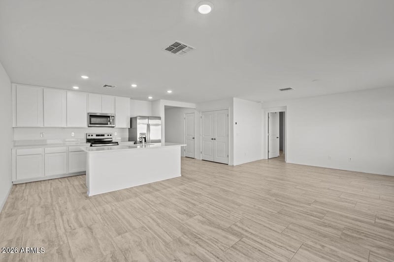Listing details for 33658 Hosta Dr, San Tan Valley, AZ 85140 : This single-story home features an open floor plan with a split-bedroom layout and gorgeous 15X30 tile flooring throughout the common areas. A generous great room offers ample living and dining space and opens to a charming covered patio, perfect for entertaining loved ones. The kitchen showcases sleek quartz countertops, a large center island and 42-in. upper cabinets for added storage space. A versatile den easily adapts to your needs, whether it's a home office or a space for family fun. The primary bedroom, located at the back of the home for added privacy, includes an en suite bath with a walk-in shower, dual-sink vanity and oversized closet. Additional highlights include a dedicated laundry room, WaterSense®-labeled faucets, prewiring for ceiling fans in the great room and bedroom
