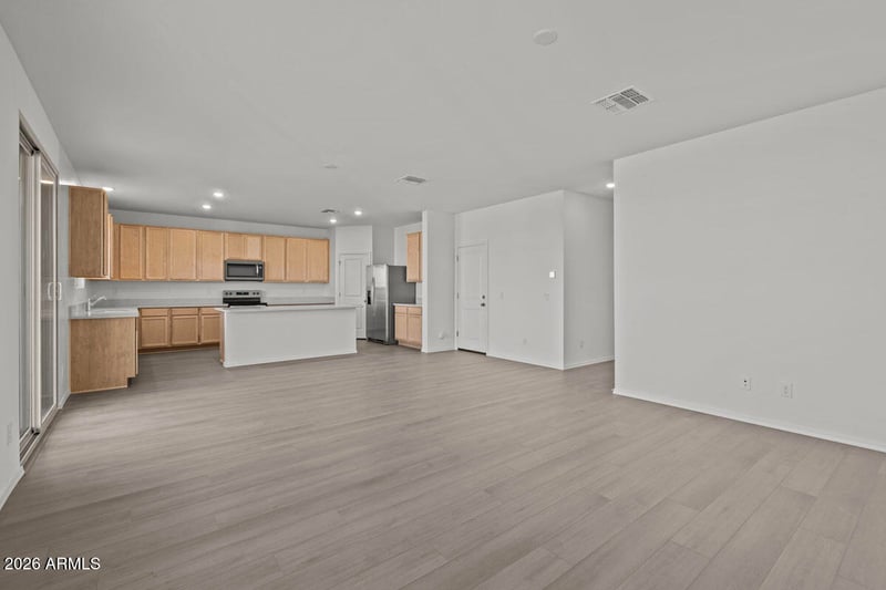 Listing details for 33706 Hosta Dr, San Tan Valley, AZ 85140 : This two-story home features an open floor plan with 9-ft. first-floor ceilings and a spacious great room that seamlessly connects the living and dining areas. An extended covered patio is the perfect setting for entertaining loved ones or quiet relaxation. Beautiful vinyl plank flooring extends throughout the first level, bathrooms and laundry, while plush carpet adds warmth and comfort upstairs. The modern kitchen showcases 42-in. upper cabinets, sleek quartz countertops, a large center island and a walk-in pantry. An open den offers flexible space for a home office or game room. Upstairs, a generous loft creates an inviting spot for family movie nights. The primary suite includes an en suite bath with a walk-in shower, dual-sink vanity and oversized closet. Additional highlights includ