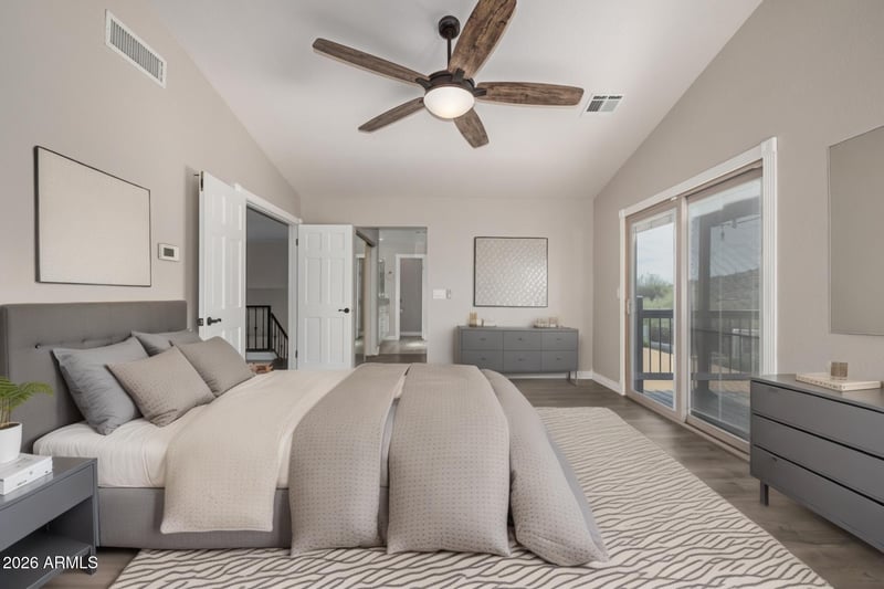 Upstairs, the primary suite is a peaceful retreat with a private view balcony overlooking the backyard and South Mountain Preserve, the perfect place to enjoy Arizona sunrises and sunsets. The spacious ensuite bath offers dual sinks, modern finishes, and a custom walk-in shower.