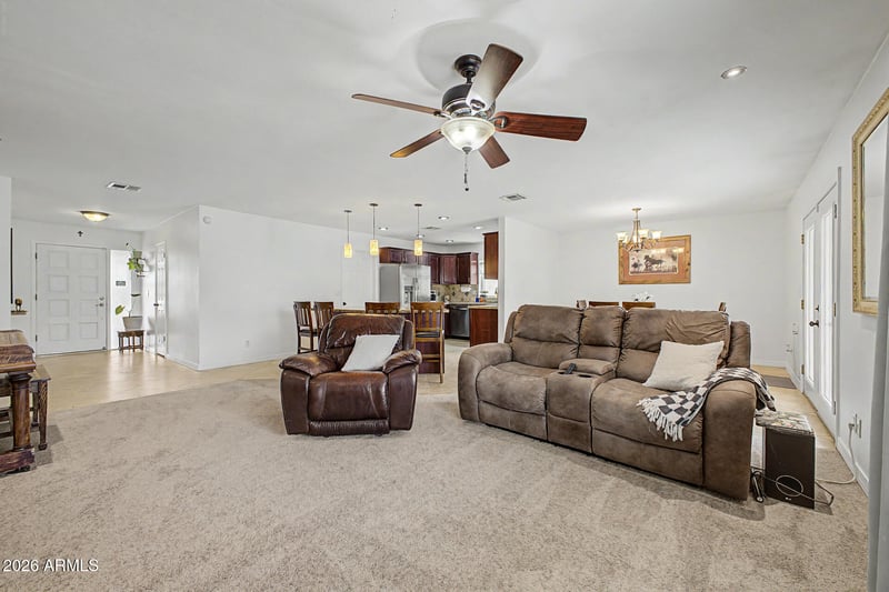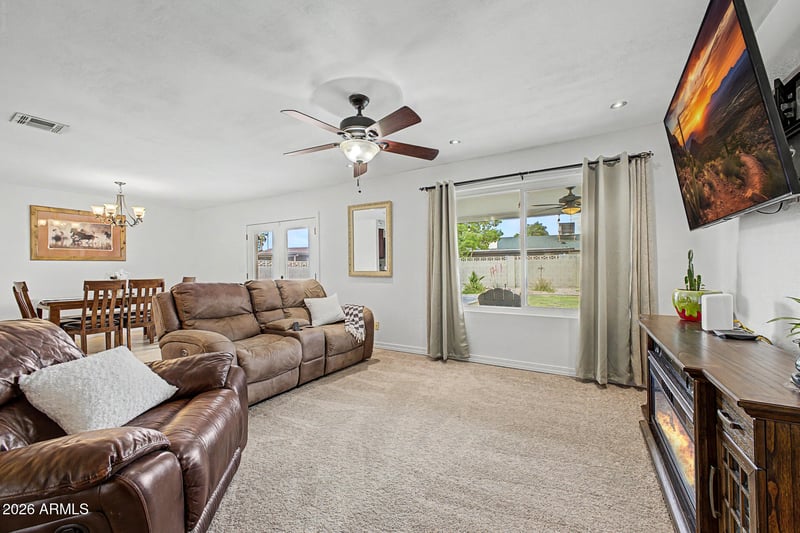 Listing details for 3430 Emelita Ave, Mesa, AZ 85204 : FRESHLY UPDATED, NO HOA! This beautiful, single level home features open concept kitchen, dining and living areas ideal for everyday living and entertaining. The kitchen offers warm, rich cabinetry, granite counters, a large island with seating, and a spacious dining room! All appliances are included - refrigerator, washer and dryer. The standout backyard, remodeled in 2024, includes a fenced play pool, stone-look modular pavers, synthetic turf inside the pool fenced area, natural grass adjacent to the seating/BBQ area, all anchored by a full-length covered patio. Major improvements include a new roof (2022), new windows (2021), resurfaced front and back patios, fresh interior paint and new carpet (all in 2026). There is even a jet tub in 2nd bath! Near shopping, restaurants and Fwys!