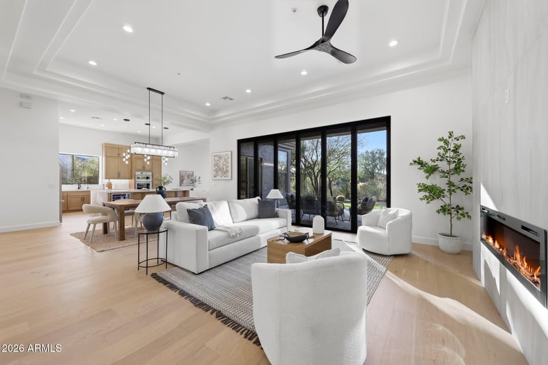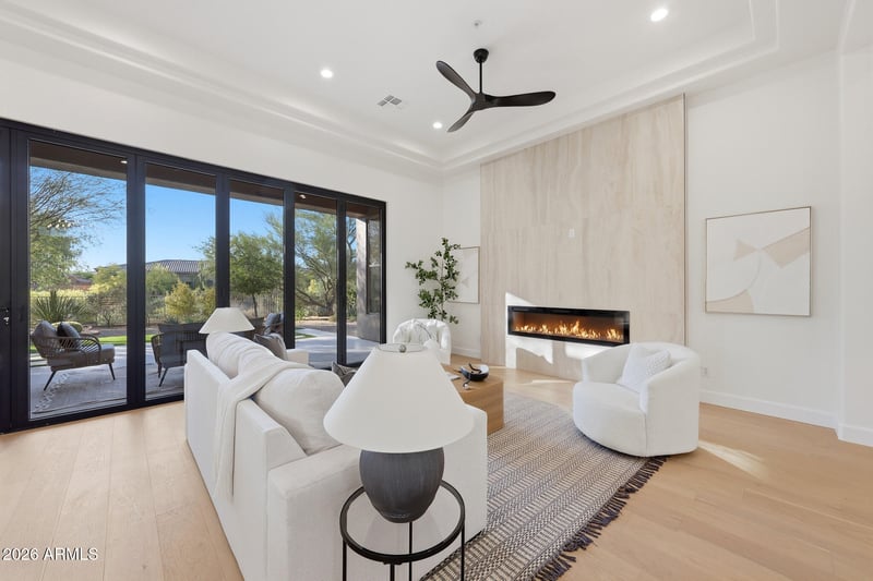 Listing details for 34440 99th St, Scottsdale, AZ 85262 : Stunning 2026 full luxury remodel that shows NEW in Legend Trail! This gorgeous 2,719 sq ft home offers a split-floorplan with 4 br & 3 ba on a private .41-acre, with Mountain and Sonoran Desert views. The open floor plan features 12-ft ceilings, 8-ft doors, European oak flooring, and two modern fireplaces. Chef's kitchen includes high-end stainless appliances, waterfall quartz countertops, two convection ovens, pantries, wine fridge and under-counter storage. New cabinetry throughout. The private primary suite offers desert views and a spa-inspired shower as well as a large walk-in closet. New roof and newer HVAC. 3-car garage with storage and epoxy flooring. Upgrades include LED and cabinet lighting, 15.4 ft door, limestone hardscape, luxury turf, and desert landscape--perfect for ... ... indoor/outdoor entertaining. Enjoy resort-style amenities including pool, spa, fitness center, tennis, pickleball, and miles of hiking and biking trails in the desirable Legend Trail Golf Club community.