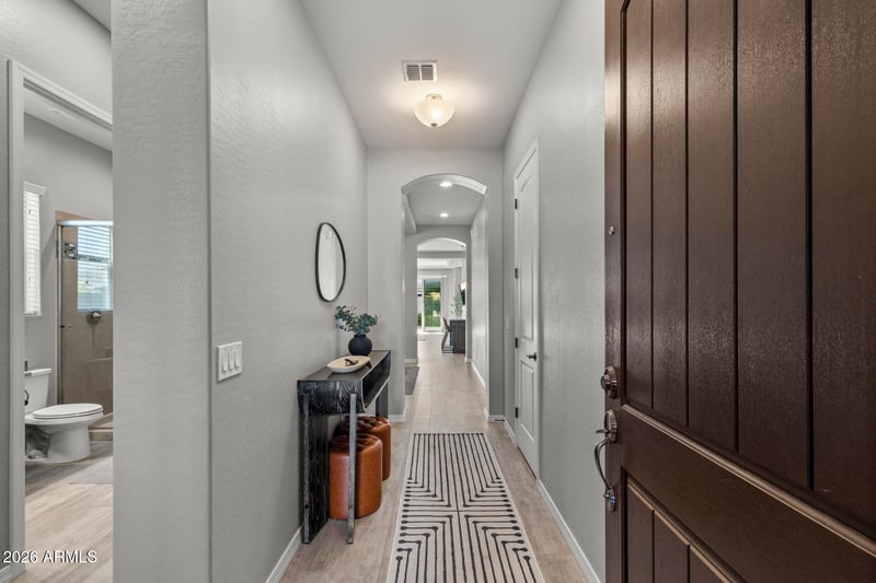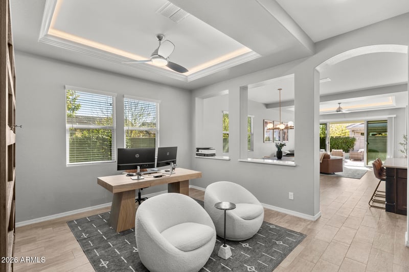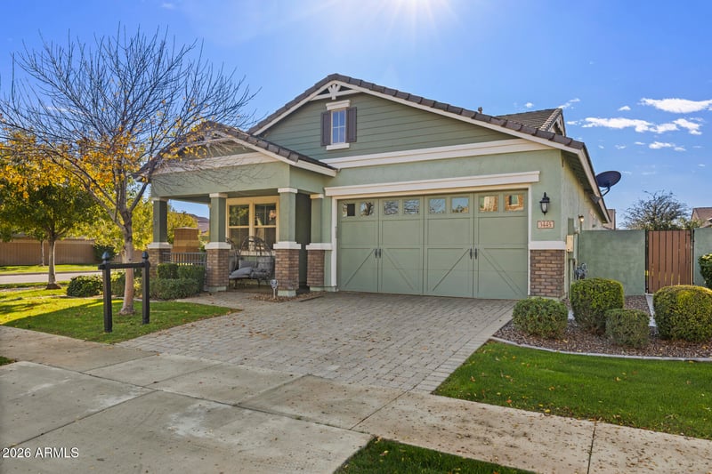 Listing details for 3445 Appaloosa Rd, Gilbert, AZ 85296 : Experience exceptional living in this beautifully maintained, very lightly lived-in home in the desirable Morrison Ranch community. Located on a premium corner lot just one block from the neighborhood park, this single-story residence offers an open great-room floor plan with split bedrooms and thoughtful design throughout. The gourmet kitchen features warm wood shaker cabinetry, quartz countertops, gas cooktop, slate-stainless appliances, walk-in pantry, and a large island. Adjacent to the kitchen is a versatile flex room perfect for an office or formal dining. Enjoy ample storage, a 3 car tandem garage, and seamless indoor-outdoor flow through the oversized sliding door to the covered patio out to the professionally landscaped backyard including a custom fire pit. No two-story homes behind, and ideal north-south orientationperfect for enjoying Arizona evenings. Situated in a desired school district and close to community amenities!