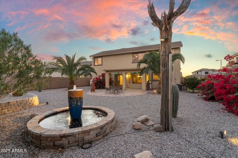 The front and back yards are fully xeriscaped for true low-maintenance living, highlighted by mature desert landscaping, mature fan palms, and a lighted backyard water feature perfect for enjoying Arizona sunsets.