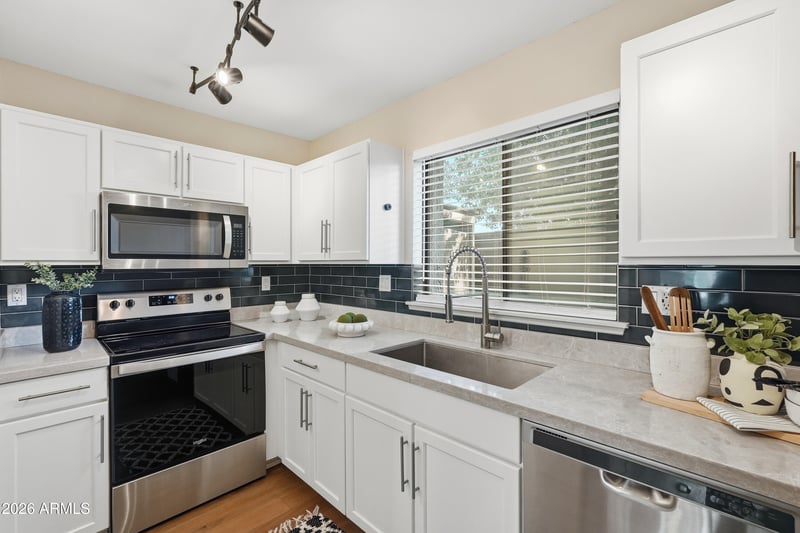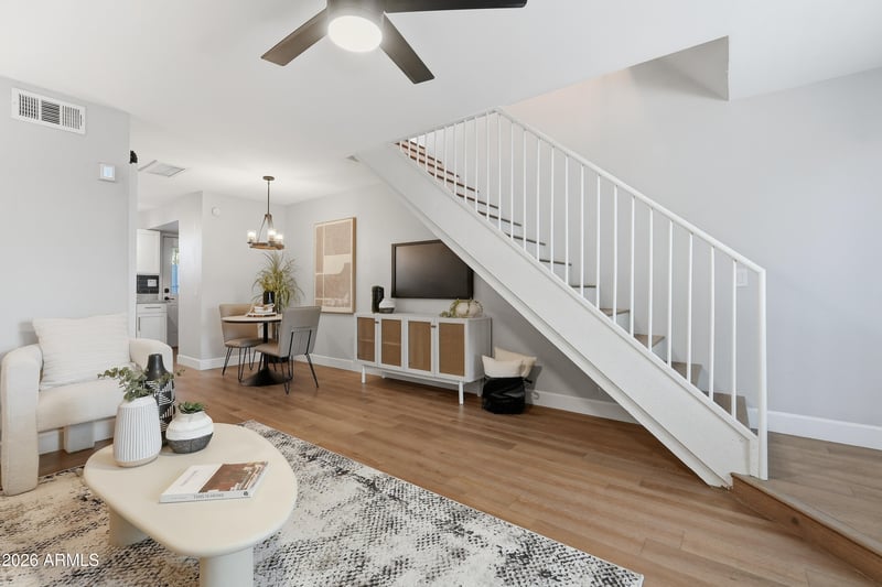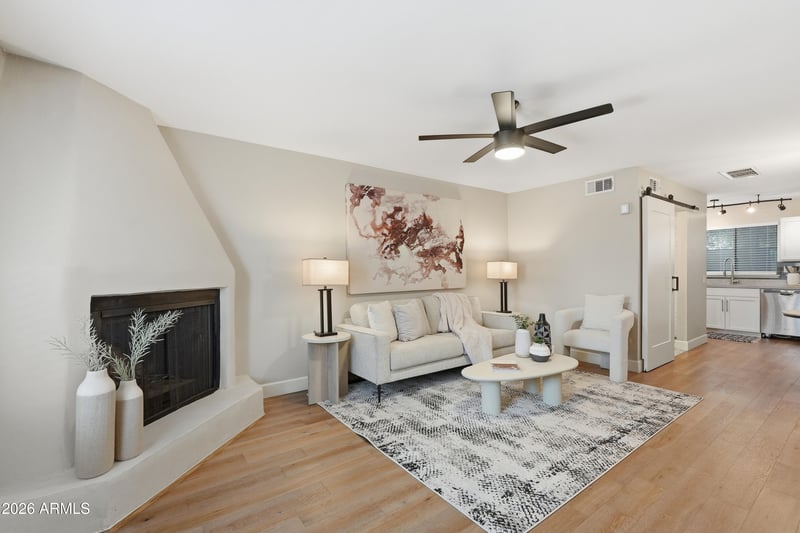 Listing details for 3501 64th St #26, Scottsdale, AZ 85251 : Completely remodeled Full 2 bedroom/ 2 Bath split level condo in prime location! Avaron Del Roco hardwood floors throughout, New shaker kitchen cabinets, Quartz counters, stainless designer sink and faucets, custom clay tile bath tile, walk-in downstairs shower, all newer appliances, full-size stack washer/ dryer. New doors, custom lighting, 90'' flat coat re-texture and designer colors create the warmest of interiors. New AC 2021.
