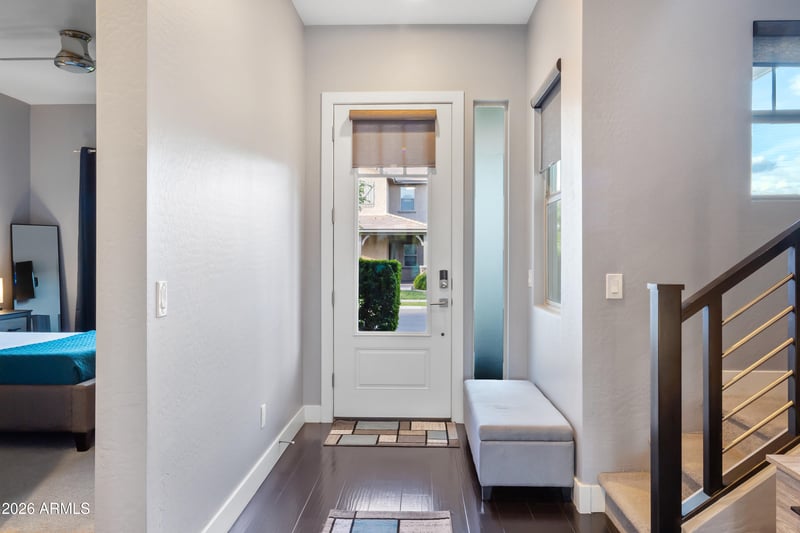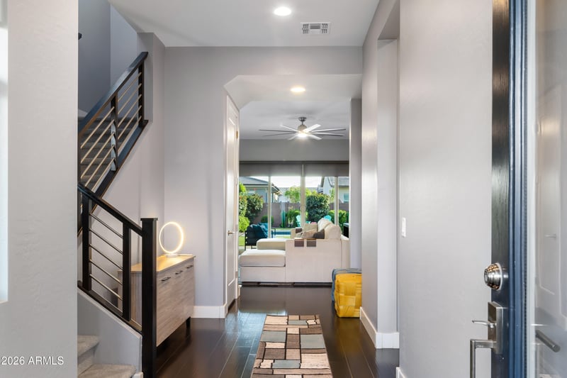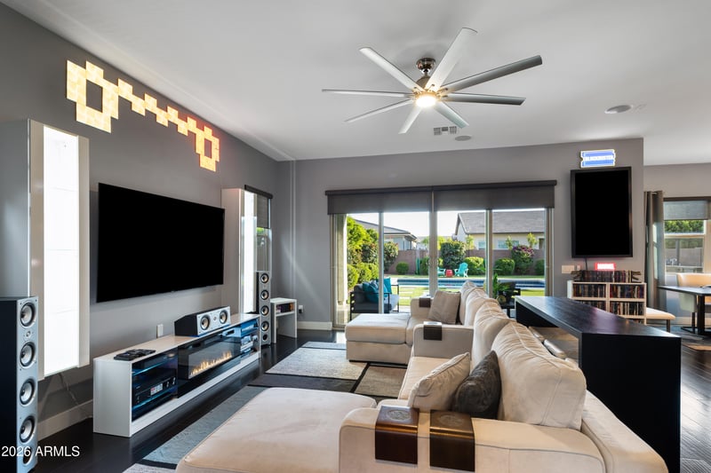 Listing details for 3527 Austin Dr, Gilbert, AZ 85296 : Located in the highly desirable neighborhood of Lakeview Trails South at Morrison Ranch, this home feels welcoming and thoughtfully designed from the moment you step inside. The light filled entryway welcomes you into the home, where wood flooring, pre-wired surround sound, and a spacious great room create a comfortable place to gather. Large glass doors open seamlessly to the backyard, blending indoor living with outdoor enjoyment. The kitchen is both beautiful and highly functional, featuring stainless steel appliances, wall ovens, quartz countertops, a mosaic tile backsplash, and an oversized island with breakfast bar seating. A walk in pantry and abundant cabinetry provide plenty of space for everyday living or hosting family and friends. The thoughtfully designed floorplan also includes a guest bedroom and full bathroom downstairs, ideal for visitors or multigenerational living, along with the added convenience of a three car garage.