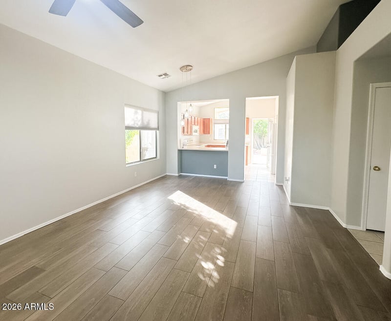 Listing details for 3553 Morse Ct, Anthem, AZ 85086 : Well-kept 3 bed, 2 bath home on a 4,832 sq ft lot near Anthem Community Center with pools, fitness, pickleball and tennis courts. 1,264 sq ft plan includes vaulted ceilings, vinyl and tile floors, ceiling fans, and kitchen with pantry and breakfast bar. Primary suite with walk-in closet and private bath. Updated HVAC (2022) and mini-split (2024). Covered patio and fenced south/west facing yard for sunset views. 0.9 mi to Daisy Mountain Trailhead and 1 mi to I-17 access. Photos and virtual tour also available on Zillow.