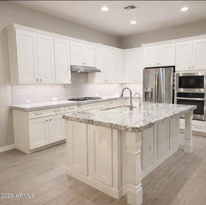 Listing details for 3560 Appaloosa Rd, Gilbert, AZ 85296 : Welcome to your dream home situated on a premium lot that backs to a green belt in the highly sought-after Morrison Ranch community! This beautifully maintained single-story residence features 3 spacious bedrooms, 3 full bathrooms, a 3-car tandem garage, and a versatile den. Nestled in a picturesque neighborhood known for its tree-lined streets and charming ambiance, this home offers both comfort and style. Step inside to an open-concept floor plan filled with abundant natural light and a seamless flow between living spaces. The heart of the home is the expansive gourmet kitchen, complete with a large custom center island, stainless steel GE Profile appliances, and ample storage, perfect for both everyday living and entertaining. The kitchen boasts beautiful cabinets with crown... molding, complemented by granite and quartz countertops and a custom tile backsplash. Adjacent to the kitchen, a dry bar with additional cabinetry creates the perfect space for a coffee bar or beverage station. The primary suite is a private retreat featuring a walk-in shower, dual sinks, and a spacious walk-in closet with built-in outlets--ideal for a makeup station or added convenience. Step outside through the stunning 12-foot atrium glass door into your own private oasis. The professionally landscaped backyard features extended travertine pavers, a custom travertine fountain, and a lush, tranquil setting that backs to a green belt, perfect for relaxing evenings or enjoying Arizona's beautiful weather. Additional upgrades and features include a tankless water heater, reverse osmosis system, water softener, built-in surround sound, custom interior paint, window coverings, wood-look tile plank flooring, and custom garage cabinetry with epoxy flooring and service door. Located within walking distance to the iconic Four Silos, residents enjoy access to a scenic lake, walking trails, biking paths, and fishing. This exceptional home truly has it all and will not disappoint!