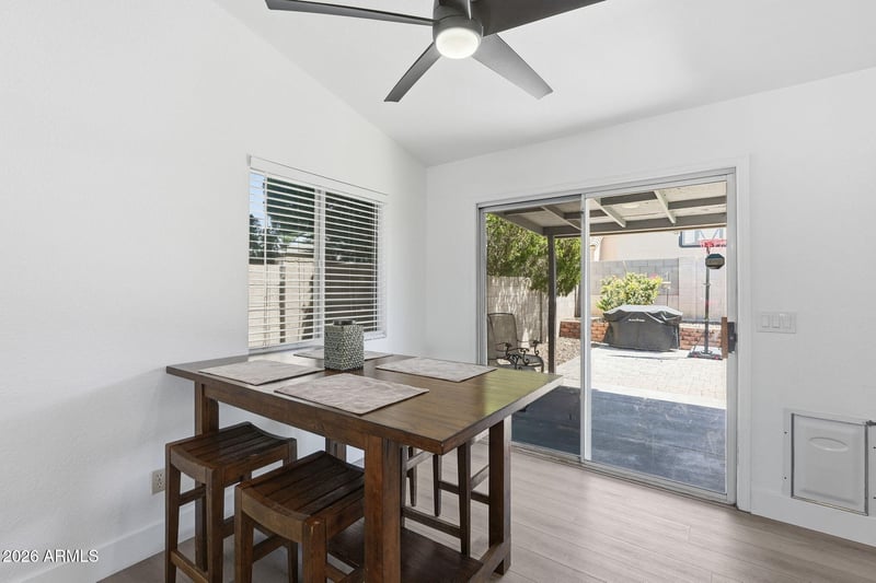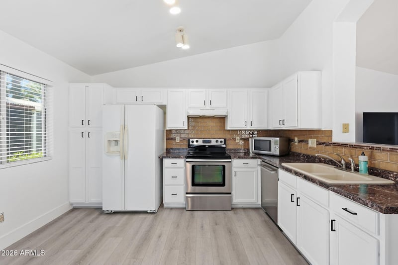 Listing details for 3607 Firehawk Dr, Glendale, AZ 85308 : Well taken care of and move-in ready, this 3 bed, 2 bath home offers 1,254 sf of stylish, comfortable living. Soaring vaulted ceilings and an open, light-filled layout create an inviting feel throughout. The refreshed kitchen shines with painted cabinetry, new hardware, stainless steel appliances, and durable laminate flooring that extends into the bedrooms. The spacious primary suite features vaulted ceilings, a walk-in closet, and a private bath with a tub/shower combo. Enjoy peace of mind with a 2021 roof, 2023 AC, and 2021 water softener. The insulated garage with epoxy floors and mini-split adds incredible flexibility. Relax in the low-maintenance backyard with covered patio, turf, and storage shed--all just minutes from the 101, I-17, hiking and all Norterra offers.