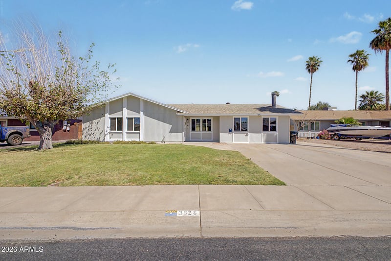 Listing details for 3628 Banff Ln, Phoenix, AZ 85053 : You don't want to miss this adorable single-story home with a sparkling pool, a casita & RV parking! Discover the inviting interior, showcasing tile flooring, tons of natural light, a brick fireplace to add warmth, and a soothing palette that makes every space feel warm and welcoming. The impeccable kitchen is complete with shaker-style cabinets, tile backsplash, quartz countertops with a breakfast bar, and stainless steel appliances. Get a good night's sleep in the main retreat, offering a walk-in closet for easy organization and an ensuite. Out back, your oasis awaits you, complete with a covered patio where you can enjoy a refreshing drink, a sparkling pool with a diving board, and a separate casita with a kitchen, perfect for family and friends. No HOA! Hurry up, this gem won't last!