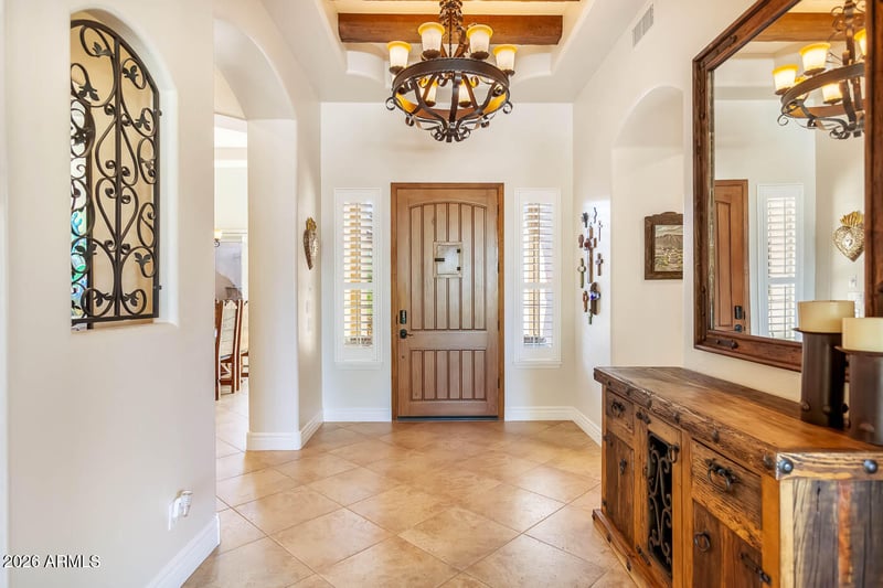 The 12-foot soaring ceilings are accentuated by rustic exposed wood rafters, creating a timeless architectural dialogue between traditional Spanish influences with rich hardwood floors that flow through the main living areas, providing warmth and continuity to the open-concept floor plan. Set on a generous 1/4-acre homesite the backyard features a heated and chilled pool, new outdoor kitchen & commercial Misters. Step through the gates of Alicante at Valencia and discover a residence that perfectly balances old-world charm with 2026 modern luxury. This sprawling 3,200 sq. ft. single-level estate, nestled on a premier 1/4-acre lot, invites you in through a charming front courtyard featuring a flickering gas fireplacea sophisticated setting for cool desert evenings.