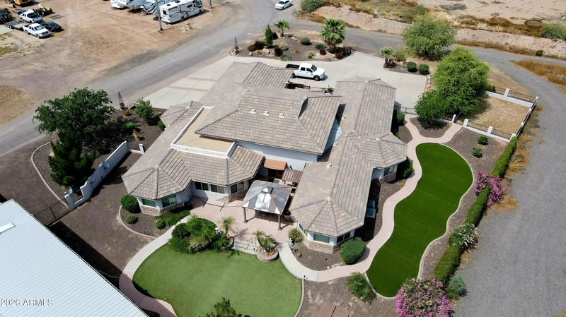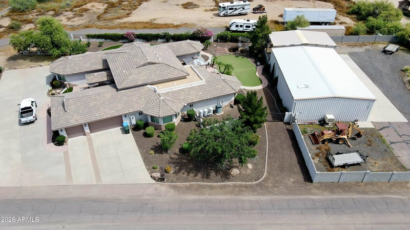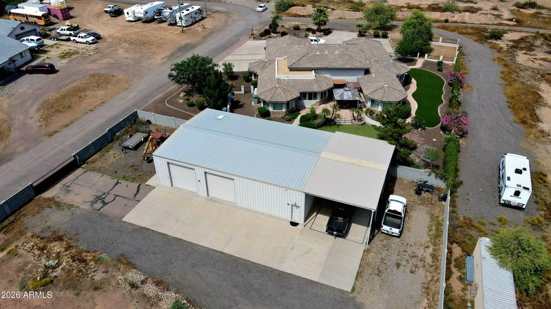 Listing details for 3655 Dynamite Blvd, Phoenix, AZ 85083 : Custom built home on an acre in North Phoenix by Deem Hills. This home was built out of Tech Block and is very Energy Efficient, the 3 car garage has a mini split A/C unit, there is a 40 x 60 Freedom Metal Building in the back with 2 - 14 ft garage doors and a man door as well as a Pickleball court under a shade on the East side of the Steel building. Walk into the home has 16 foot vaulted ceilings in the Open floor plan. There are 5 very spacious bedrooms as well as a den/office and 3.5 bathrooms. On it's own private well and alternative septic system make this home very affordable for utilities. Bring your small business, RV and all your toys for country living right in the heart of North Phoenix. Ideal for use as an assisted living or senior living with large doorways and hallways.