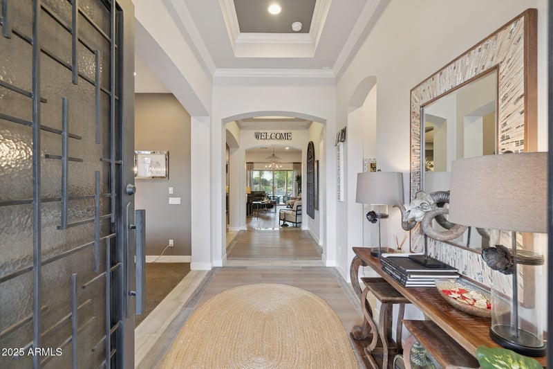 Listing details for 3694 Aster Dr, Chandler, AZ 85286 : Exceptional value on the water. This former builder model in the Layton Lakes premium gated community offers a rare blend of luxury, lifestyle, and flexibility. Soaring ceilings designed specifically for this model create an open, elevated feel throughout. A private Next Gen-style suite includes its own en-suite bath, private TV room, kitchenette, and laundry ideal for guests, multi-gen living, a home office, or a gym. The gourmet kitchen features a massive island, extended cabinetry, and designer finishes flowing seamlessly into spacious living and dining areas. Step outside to a true resort-style backyard with over $200K invested: heated pool and spa, built-in BBQ with bar seating, putting green, bocce court, custom bench swing, and a stand-alone covered TV lounge overlooking the water.