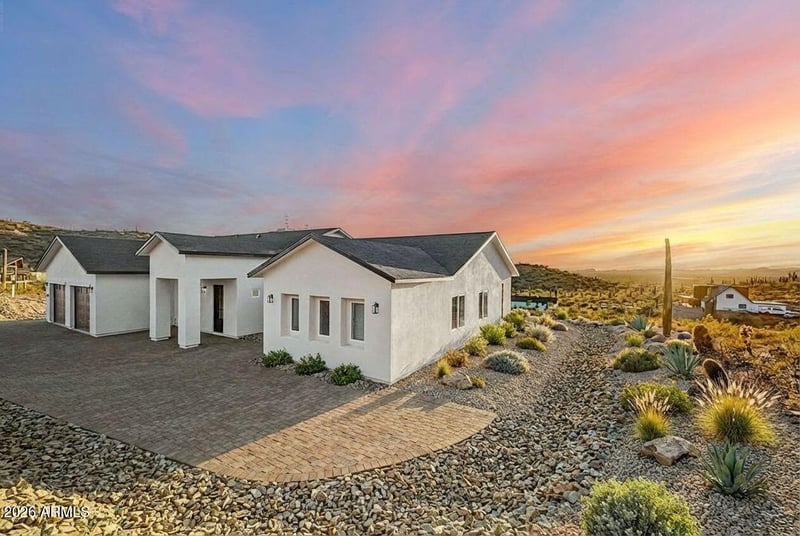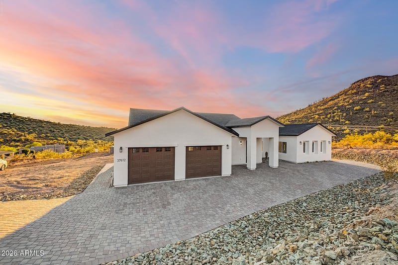 Listing details for 37612 34th Ave, Phoenix, AZ 85086 : Newly constructed home on a 1.3-acre lot with breathtaking mountain views in every direction. The expansive backyard offers endless potential -- room for a resort-style pool, tennis or pickleball court, detached garage, and outdoor kitchen.Inside, soaring ceilings and luxury vinyl plank flooring flow throughout an open, light-filled floor plan. The chef's kitchen features a Quartz Taj Mahal waterfall edge island, wood shaker cabinetry, stainless steel appliances, pendant lighting, and a tile backsplash. The primary suite includes a spa-inspired ensuite with double sinks, floor-to-ceiling tile in the shower, and a walk-in closet. Additional highlights include custom pavers, a covered patio, and an EV charging plug in the 2-car garage.