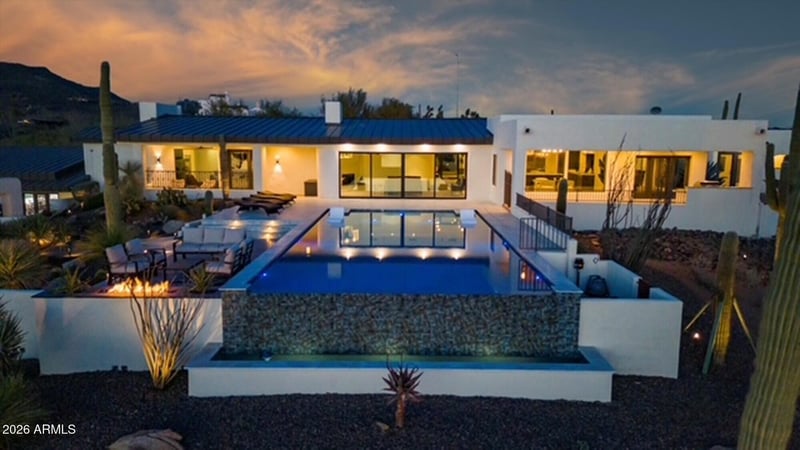 Listing details for 37801 Stirrup Cir, Carefree, AZ 85377 : Exceptional 9.8 acre gated ranch estate with three private entrances, ideally positioned at the end of Pima Road in Carefree. Enjoy a rare blend of privacy and convenience with quick access to Scottsdale, the airport, and the small-town charm of Carefree and Cave Creek. The property captures sweeping 360-degree mountain views with stunning sunrises and Arizona sunsets from each window. An rare opportunity combining luxury living, equestrian facilities, and substantial car collector storage in one versatile compound. Resort style living unfolds at the spectacular elevated pool and spa patio, where an infinity edge pool draws your eye toward breathtaking sunsets and twinkling city lights, complemented by inviting firepit seating designed for memorable evenings of entertaining.