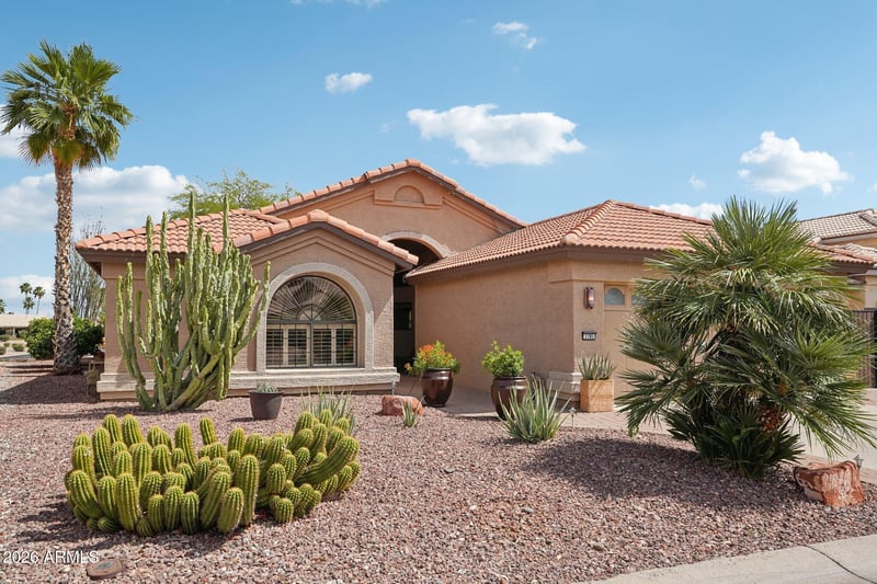 Listing details for 3785 150th Ln, Goodyear, AZ 85395 : Looking for quality & luxury with spectacular views in Pebblecreek? This turn key remodeled residence is the one! 2 bed/2 bath plus den & open great room plan on the 10th green of Eagles Nest course boasts vaulted ceilings with tons of natural light. Interior has been fully updated with no expense spared including chef's kitchen with custom cabinets, honed quartzite counters/backsplash and high end appliances La Cornue stove and hood custom made in France and Sub Zero refrigerator. Luxury vinyl plank flooring, baseboards and gorgeous baths with granite counters and tiled showers. Designer home comes fully furnished with Restoration Hardware throughout. Backyard has covered patio, tiled flooring, built in BBQ and beautiful planters where you can relax and take in the golf and mountain view