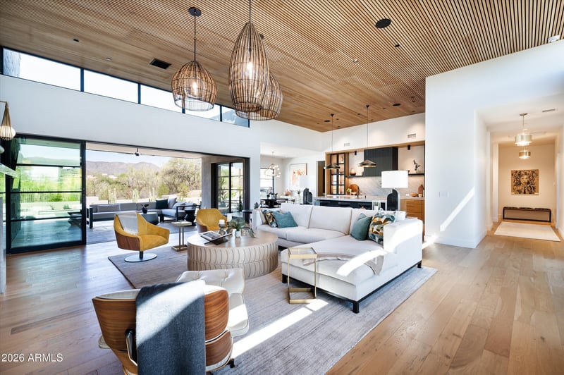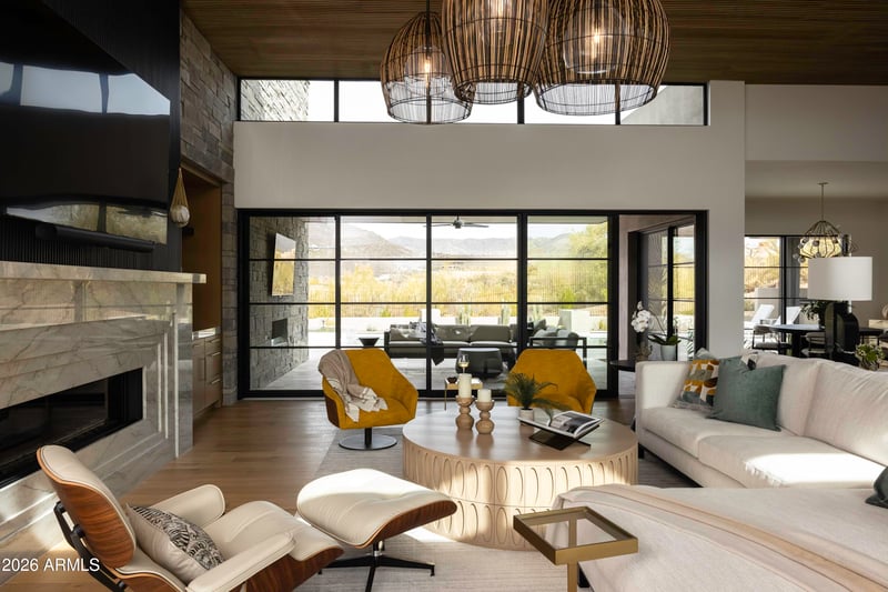 Listing details for 38070 93rd Pl, Scottsdale, AZ 85262 : New golf listing in prestigious Desert Mountain--where luxury, design, and breathtaking scenery come together seamlessly. This nearly new, fully furnished, single-level contemporary masterpiece showcases an exceptional great room floor plan, thoughtfully designed for both everyday living and effortless entertaining. A full golf membership available, elevating the Desert Mountain lifestyle experience. From the moment you enter, you're greeted by panoramic desert views stretching across Lone Mountain and glowing sunset horizons. Walls of glass invite the outdoors in, creating a seamless connection to the surrounding natural beauty. At the heart of the home is a stunning chef's kitchen, complemented by a secondary catering kitchen and walk-in pantry featuring. ...extensive custom cabinetry--perfect for hosting on any scale. Step outside to your private resort-style retreat. The expansive patio features a sparkling pool and spa, dramatic water and fire elements, and a covered lanai ideal for BBQs, al fresco dining, and outdoor living with TV. An additional covered lounge area with fireplace and TV provides the perfect setting to unwind--all while taking in Arizona's unforgettable sunsets. The home is richly appointed with upgraded designer finishes, custom lighting, and a full smart home system with motorized shades throughout. A separate two-room attached casita offers ultimate flexibility, complete with its own living area, kitchen, and en-suite bedroom--ideal for guests or extended stays. The professionally designed landscape enhances both privacy and curb appeal, while custom furnishings are included to create an immediate, elegant setting. This is Desert Mountain living at its finest--refined, relaxed, and absolutely unforgettable.