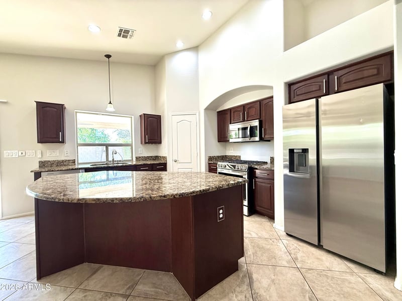 The backyard is truly designed for entertaining and relaxation, featuring a sparkling pebble-finish pool, dramatic rock waterfall, in-ground spa, and an expansive built-in BBQ area--ideal for hosting gatherings or enjoying Arizona evenings at home. Mature shade trees, citrus trees, and flourishing grape vines create a lush, tranquil outdoor retreat that feels like your own private resort.