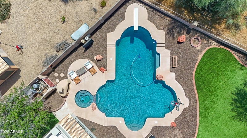 The spacious backyard features a private pool with diving board and backs to a natural wash, offering added privacy and peaceful desert views. An RV gate with dedicated parking adds valuable flexibility.