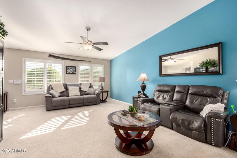 Listing details for 4042 183rd Ln, Goodyear, AZ 85338 : Gorgeous Home with Resort-Style Backyard with RV Parking & Paid in Full Solar Panels. Welcome to this stunning, meticulously maintained home located in the highly desirable Las Brisas neighborhood. This pristine 3-bedroom, 2-bath home also features a versatile den, perfect for a home office, flex space, or hobby room. Inside, you'll find vaulted ceilings and plantation shutters throughout, creating a bright and elegant atmosphere. The beautifully updated kitchen offers new granite countertops, custom taupe cabinetry, a large island ideal for entertaining, and stainless-steel appliances, including a touch-to-light refrigerator. The spacious primary suite features a walk-in closet and a fully remodeled ensuite bath with custom cabinetry, dual sinks with marble countertops, and a walk-in shower complete with a bench and waterfall shower head. The secondary bedrooms are generously sized with walk-in closets and thoughtfully laid out. The garage is truly a standout designed for both function and comfort with custom cabinetry, a utility sink, insulated garage door, epoxy flooring, and a mini-split A/C unit. Step outside to a resort-style backyard featuring a sparkling pool with a waterfall, artificial turf, and custom pavers that extend along the sides of the home. Enjoy outdoor living year-round under the covered patio with ceiling fan and remote-controlled shades for added comfort. Built in grill/bar with refrigerator is perfect for entertaining. With no neighbors behind, the home backs to a peaceful greenbelt offering added privacy and views. Additional highlights include an RV gate with ample parking for toys, vehicles, or a boat, plus a storage shed. Best of all save on your electric bill with paid in full solar panels. This exceptional home truly has it all comfort, upgrades, and lifestyle!