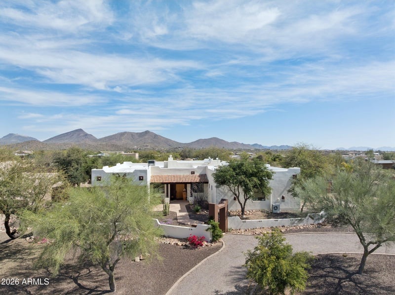 Listing details for 40627 6th Ave, Phoenix, AZ 85086 : Desert retreat with panoramic mountain views and stunning sunsets on over an acre! This 4 bed, 4.5 bath custom home sits in a private setting on a secluded cul-de-sac facing open space with a view of Daisy Mountain. Enjoy sunsets from your front courtyard or extended covered patio perfect for relaxing or entertaining. The split floor plan allows for privacy, and blends functionality and space with each bedroom being en-suite with walk-in closets, and a dedicated home office. Inside you'll find a soaring great room with a stone fireplace, chef's kitchen with stainless steel appliances, pantry, breakfast bar, and a stylish dry bar complete with both wine and beverage fridges. A living room with wood beam accents offers more room to gather, or bring your pool table. The primary suite features private patio access, a spa-like bath with jetted tub, and a generous walk-in closet. The oversized 3-car garage includes a cooled/heated workshop which has endless other possibilities for an exercise room, art studio, business office, or great space for that prized car. **Extras include a gazebo, fire pit, RV gate and hook-up with room for your RV, boat or toys. All in a quiet neighborhood minutes to Lake Pleasant, hiking and horseback trails, shopping and freeway access.**