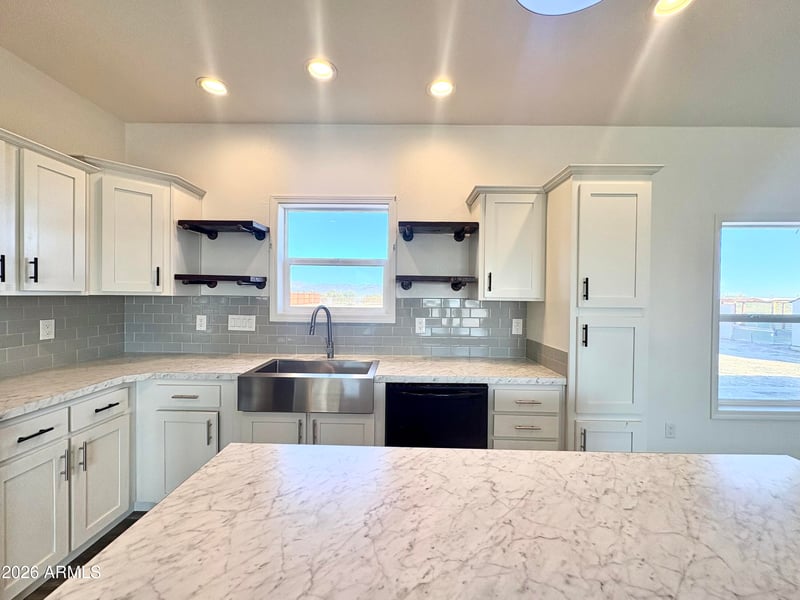 2022 manufactured home- tile in walking areas, & carpeting in the rooms. Featuring A split master bedroom with a relaxing spa-like shower and bath. Large open Living room, eat in the kitchen that includes a refrigerator, beautiful subway backsplash tile, & a farm sink. A neutral paint palette, ready to add your decor & a laundry room complete with custom clothing storage. Next, if you work from home, there is a flex room or office space ready! Step outside to your relaxing acre+ BACKYARD surrounded by mountain views and the Gorgeous Arizona sunrise or sunsets