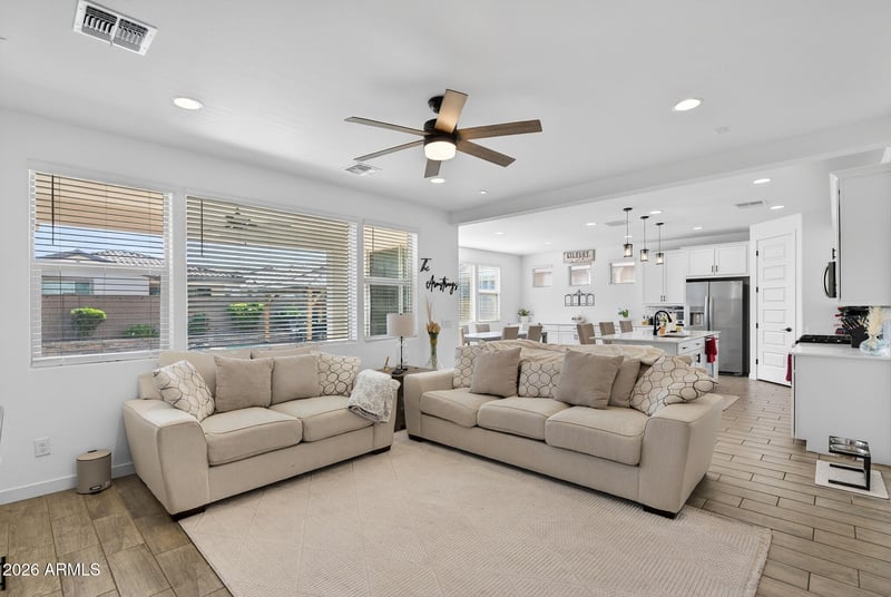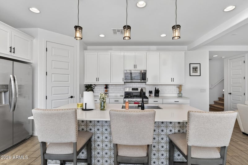 Listing details for 4115 Appaloosa Rd, Gilbert, AZ 85296 : Located in the desirable Warner Meadows subdivision, this two-story home offers 4 bedrooms and 3 full bathrooms with thoughtful upgrades throughout. The open-concept kitchen features extended quartz countertops with a spacious breakfast bar, upgraded cabinet hardware, and a newly installed backsplash perfect for everyday living and entertaining. Wood-look porcelain tile flows throughout the main level. Upstairs includes a versatile loft and ample storage, including an impressive wrap-around under-stair storage area. Highlights include an upgraded emergency flood prevention system, EV plug in the garage, and recently updated backyard with pavers. The front yard showcases upgraded turf for low-maintenance curb appeal. Convenient Gilbert location close to schools, shopping, and dining. **Outdoor gazebo and above ground hot tub are excluded from sale of home**