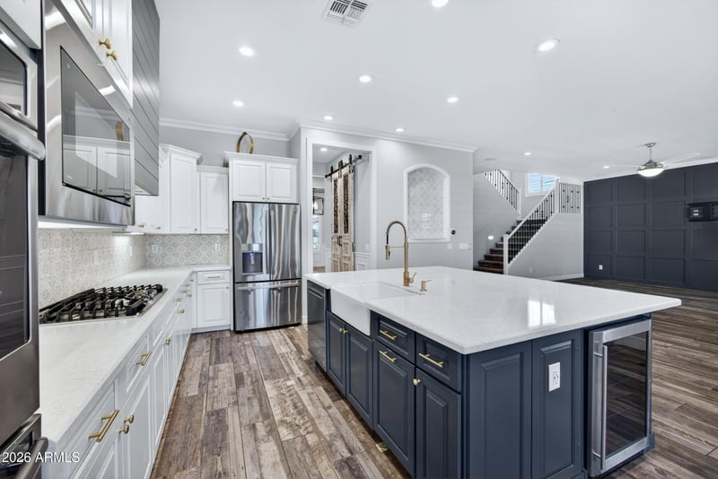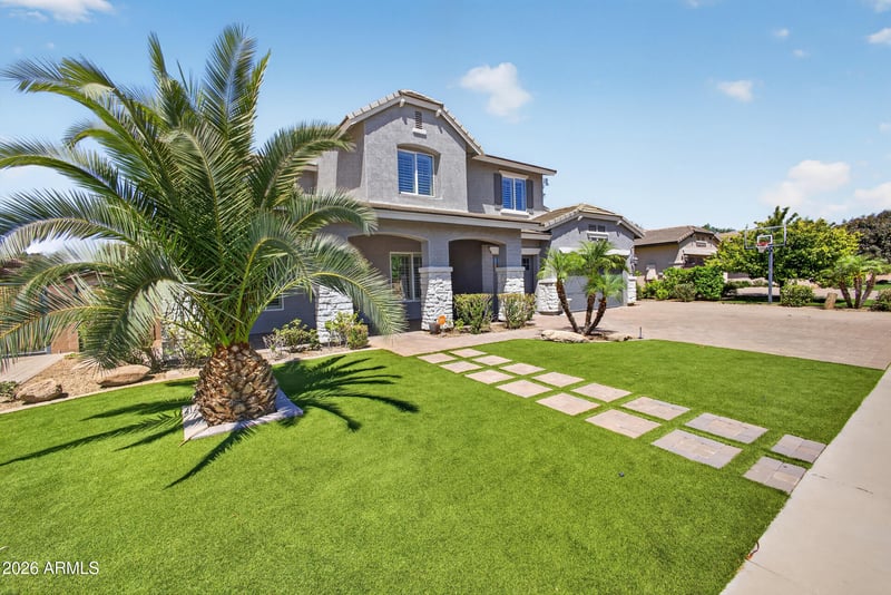 Listing details for 4126 Gable Ave, Mesa, AZ 85206 : Step into refined living with this stunning 4-bedroom, 3.5-bathroom estate offering 4,039 square feet of thoughtfully designed space on a generous 9,782 sq ft lot. From the moment you arrive, the home's striking curb appeal is evident with low-maintenance turf landscaping, mature palm trees, white brick veneer, a paver walkway, and a spacious 3-car garage. A covered front patio creates a welcoming entry, while added features like a Vivint security system, RV gate, and built-in basketball hoop elevate both function and lifestyle. Inside, you're greeted by a versatile bonus space ideal for formal dining, highlighted by elegant wainscoting and a tray ceiling. The main level showcases wood-look tile flooring throughout and includes a private downstairs office with glass French doors and a custom wood slat feature wall--perfect for working from home in style. The open living area features a bold custom black accent wall and seamlessly connects to a chef-inspired kitchen designed to impress. The kitchen is a true centerpiece, complete with an oversized island, marble countertops, GE stainless steel appliances, double ovens, a 5-burner gas cooktop, built-in microwave, farmhouse sink, custom vent hood, and gold fixtures throughout. A large walk-in pantry with rustic barn doors and a reverse osmosis system add both charm and convenience. The downstairs primary suite offers a private retreat with plush custom carpeting, abundant natural light, and a striking black shiplap feature wall. The spa-like primary bathroom features dual vanities, a soaking tub, walk-in shower, private toilet room, and an expansive walk-in closet with custom built-ins and glass entry. Additional main-level highlights include a stylish powder bath with shiplap accents and black marble sink, a spacious laundry room with checkerboard tile, utility sink, extra refrigerator space, and designer finishes, as well as a functional mudroom with built-in storage. The garage is equally impressive with epoxy floors, insulated doors, built-in cabinets, a tankless gas water heater, and water softener system. Upstairs, entertainment takes center stage with a fully equipped home theater featuring a built-in projector, large screen, tiered seating, and plush carpeting. Secondary bedrooms are generously sized, including one with custom wood feature walls, and are complemented by a Jack & Jill bathroom and an additional full bath, all upgraded with custom tile work and modern finishes. The backyard is an entertainer's dream, complete with lush turf, a large tiled patio, and a resort-style pool with a dramatic fountain feature and spa. Enjoy Arizona evenings under the covered patio with a built-in TV, tiled fireplace, gas fire feature, misting system, and even an in-ground trampoline for added fun.