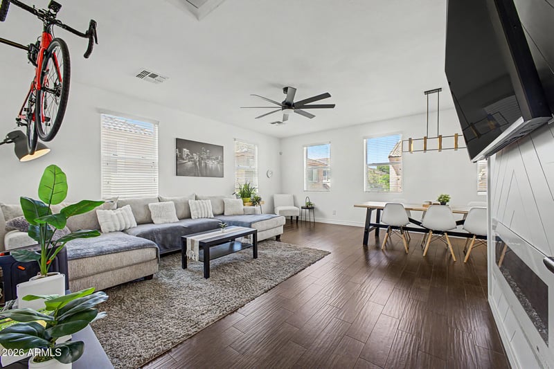 Listing details for 4131 Carla Vista Dr, Gilbert, AZ 85295 : 1,607 sq ft, 3 bedroom, 2 bath plus a bonus room/den, charming, modern, and perfectly situated--this beautifully updated home is directly across from a lush neighborhood park, offering the ideal blend of style and location. From the moment you arrive, you'll notice the inviting curb appeal and thoughtfully designed interior featuring a light, bright, and contemporary aesthetic. The split floor plan offers versatility and privacy, with two bedrooms, a full bathroom, and a spacious family/bonus room located downstairs--perfect for guests, a home office, or additional living space. Upstairs, you'll find the main living area with an open-concept family room and kitchen, along with an additional bedroom. The kitchen is both stylish and functional, featuring white cabinetry, a glass tile backsplash, and stainless steel appliances, all opening seamlessly to the family room--ideal for entertaining. The family room is warm and inviting, highlighted by an electric fireplace that adds both charm and comfort, while the open layout creates a seamless flow between the kitchen, dining, and living spaces for easy everyday living. Additional highlights include a 2-car garage and a layout designed for both comfort and functionality. Step outside and enjoy easy access to green space, walking paths, and all the charm of park-front living right at your doorstep, all located in the heart of Gilbert near shopping, dining, and top-rated schools.