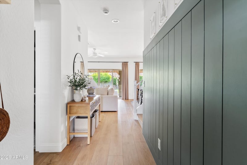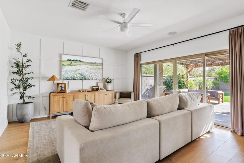 The backyard has been completely transformed into a private outdoor retreat with custom landscaping, turf, pavers, and a beautiful pergola that creates the perfect shaded space for relaxing or entertaining.
