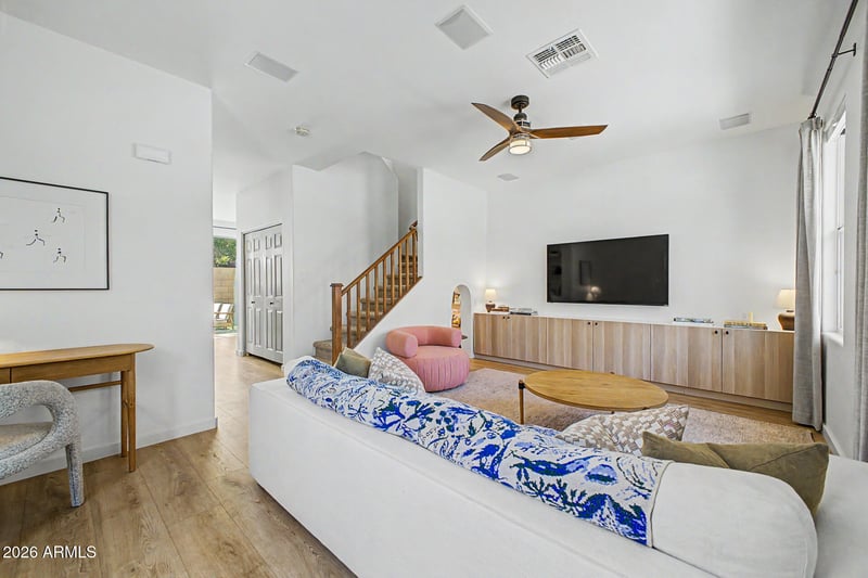 Listing details for 4157 Milky Way, Gilbert, AZ 85295 : Welcome to the highly sought-after The Willows in Gilbert--offering quick access to freeways, shopping, dining, and San Tan Village. This beautifully updated 3-bedroom, 2.5-bath home with a 2-car garage features a bright, semi-open floor plan with neutral tones, dual-pane windows, and new wood-look flooring throughout the main areas. The kitchen includes granite countertops, stainless steel appliances, ample cabinetry, pantry space, and a stylish beverage bar--perfect for entertaining. Upstairs, all bedrooms are generously sized, including a spacious primary suite with walk-in closet and dual vanities. Thoughtful upgrades and maintenance throughout include: new HVAC (2023) with regular tune-ups, new water heater and water softener (2026), updated lighting and ceiling fans, smart doorbell and thermostat, custom blinds, remodeled closets, new shut-off valves, and all appliances included (washer, dryer, refrigerator). The backyard is designed for easy Arizona living with low-maintenance synthetic grass, pavers, a raised garden, and ambient lighting--ideal for entertaining. Unique features like a custom under-stair play space add charm and functionality. Why this beats nearby new builds: move-in ready with upgrades already completed, included appliances and window treatments, professionally maintained systems, and a finished backyard--saving you time, money, and post-close projects. Enjoy close proximity to the Epicenter at Agritopia--a vibrant destination where dining, shopping, and living come together in a walkable, urban-style setting and Verde at Cooley Station with eateries like Hash Kitchen, Origen and Crust Italian. Located in a community with pools, parks, greenbelts, and sports courts, this home offers both lifestyle and value.