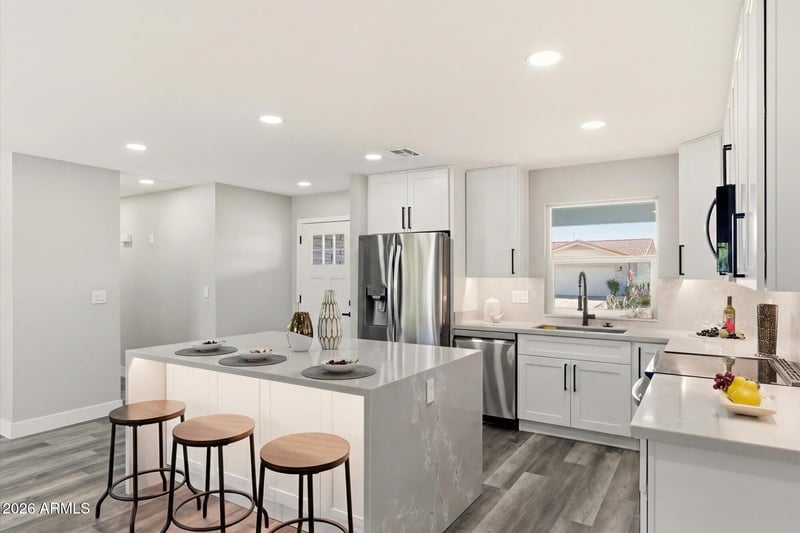 Listing details for 4160 Carmel Ave, Mesa, AZ 85206 : Completely remodeled home with beautiful new LVP flooring throughout.The open floor plan allows a flood of natural light to shine in and show off the well laid out living area.The large waterfall island provides that additional space which is always appreciated when cooking or entertaining.The kitchen features beautiful quartz countertops, new cabinets and appliances. A new mini split system has been installed in the AZ room to give you additional year round use. The 10 year old roof and the 2022 A/C system offers peace of mind. Outside, a newly added block fence surrounds the property, providing extra privacy and security.The double side gate offers a perfect parking solution to secure your golf cart in the back.The garage flooring has been painted for easy maintenance. A must see home.