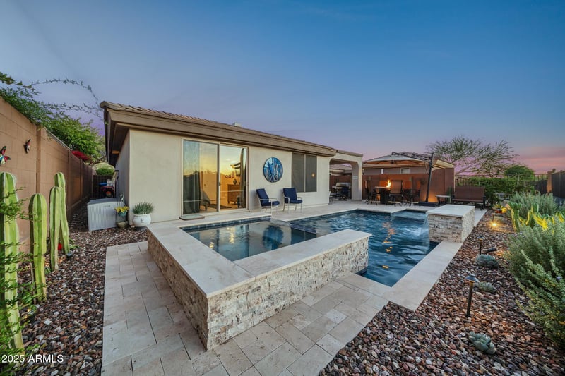 Step outside to your private oasis: a stunning new pool with a soothing waterfall, customizable LED lighting, Baja shelf, and integrated hot tuball fully Wi-Fi controlled. The backyard also includes a travertine patio, motorized sunscreen, and lush landscaping set against mountain and fairway backdrops.