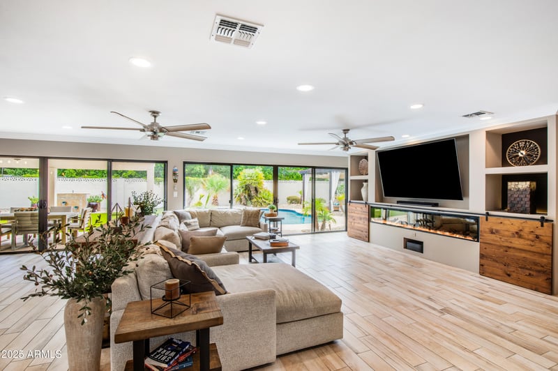 Listing details for 4227 62nd St, Scottsdale, AZ 85251 : From the moment you walk through the front door you'll know you are home! A charming foyer greets you and opens to great living area with cozy bar seating and beverage refrigerators for entertaining. Then you pass through to a spectacular 40'x 20' great room with a fully renovated kitchen, large island with seating, quartz counters, stainless appliances and a huge wall of built ins and gorgeous fire feature. Two huge banks of sliding doors offer killer views of the gorgeous backyard with pool, artificial turf, built in bbq and charming cabana. The primary bedroom has french doors to the front and a spa-like bathroom with custom vanity, large shower, soaking tub and a great closet with built ins. 3 additional bedrooms (one split)and a work space in the hall offer options for office & more!