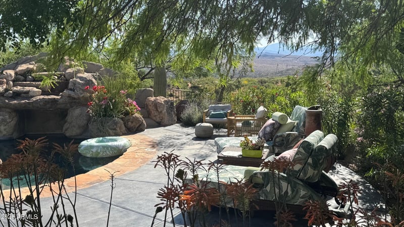 Listing details for 42421 Deer Trail Rd, Cave Creek, AZ 85331 : Custom pretty pueblo ideally seated on 1.5 acres for total privacy with multiple private patios and spectacular vistas/views of Four Peaks, Weaver's Needle with Tonto National Forest surrounding. Three en-suite bedrooms, dedicated office with new wood flooring, new HVAC's, new appliances and new custom interior and exterior lighting. Botanical secret gardens curated for the enjoyment of all in residence enchant year round. The pool patios are totally private with covered dining multi lounge areas that capture the Sonoran skies at their most beautiful. Remodeled primary suite and guest suite with hand painted tile in both.