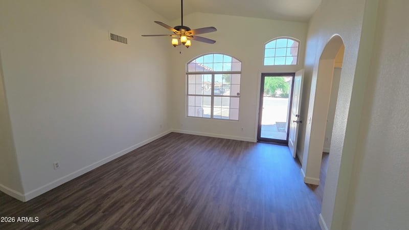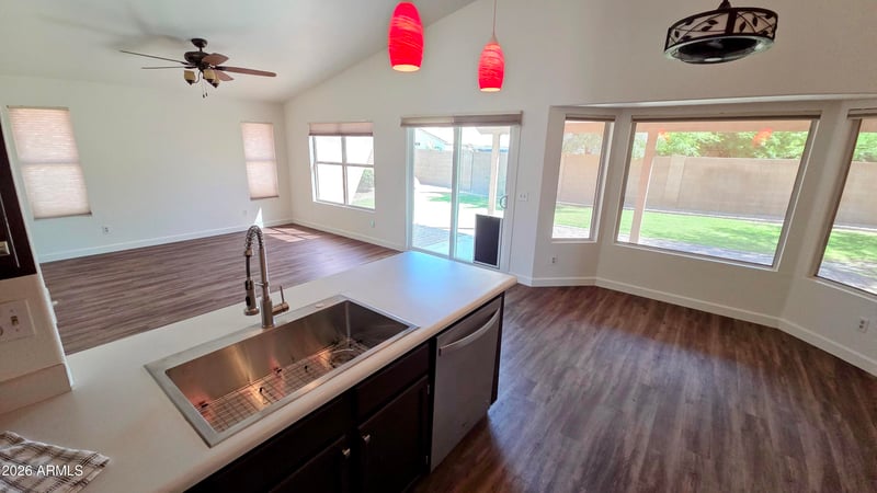 Listing details for 4315 Baywood Ave, Mesa, AZ 85206 : Charming single-level 3 bed, 2 bath home with an open, flowing floor plan. Vaulted ceilings in the living areas create an airy, expansive feel connecting the large kitchen, living room, and family room. The split-bedroom layout offers privacy; the primary suite features double-door entry and direct access from the bath to the patio. Both bathrooms have been remodeled with updated shower and tub. Kitchen updates include newer appliances and a single-basin stainless steel sink. Durable LVP flooring and tall baseboards run throughout. Outdoors: a manicured backyard that feels like a park, extra storage, and generous side yards.
