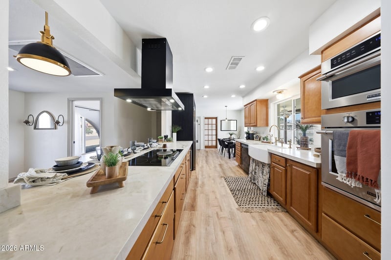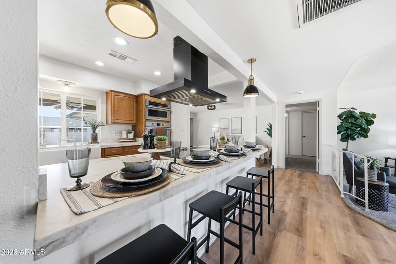 Listing details for 4327 Echo Ln, Glendale, AZ 85302 : Move-in ready 4-bedroom, 2-bath home with an impressive upgraded kitchen featuring Taj Mahal countertops, wall built in oven and microwave, downdraft hood vent, built-in wine cooler, and oversized refrigerator. The adjoining family room offers a cozy brick fireplace, while the backyard is perfect for summer with a sparkling pool. Brand-new carpet, fresh paint, and recent upgrades throughout, plus an attached shed ideal for extra storage, make this home easy to love and easy to settle into.