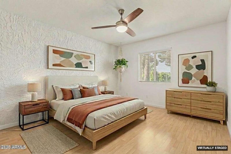 Listing details for 4444 Paradise Village Pw #241, Phoenix, AZ 85032 : Beautifully remodeled upper-level condo in a quiet community across from Sweetwater Park! This unit features an open split floor plan with wood laminate flooring, slate tile in both bathrooms, and a fully tiled walk-in shower in the primary suite. The kitchen boasts stainless steel Energy Star appliances, modern finishes, and a breakfast bar that opens to the living and dining areas. The versatile second bedroom includes double wood doors—perfect as a guest room, office, or flex space. Enjoy mountain views from the private balcony in this peaceful location. Community amenities include a sparkling pool, relaxing spa, tennis courts, and conveniently located laundry facilities. Close to shopping, dining, and recreation, this well-maintained condo offers comfort, style, at a great price!