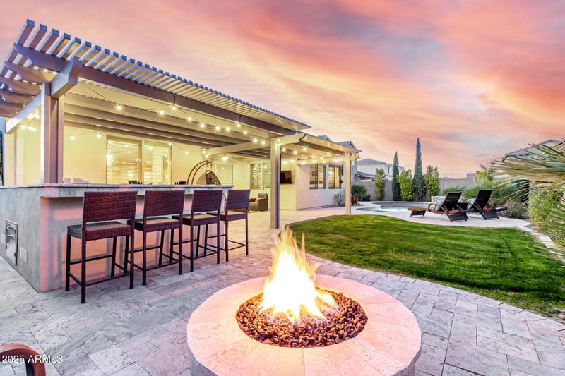 Listing details for 4455 Matter --, Mesa, AZ 85212 : It's PERFECT! From the moment you walk through the gorgeous custom iron front door you are greeted with upgraded flooring, lighting, and high-end wood shutters throughout and it doesn't stop there! The kitchen is one you normally see if custom homes with extensive cabinet upgrades, butlers pantry, 48 inch GE Monogram professional range & built in ovens & refrigerator!! In the primary bath experience luxury in the tile super shower with frameless glass and upgraded fixtures. The list of upgrades in the backyard goes on and on from the travertine decking, patio TV, aluminum pergola, built in kitchen, gas fire pit, and heated pool & spa! Solar panels & Tesla power wall & car charger make this home comfortable & efficient! Combined w/ the sunset views and convenience of Eastmark, you're home!