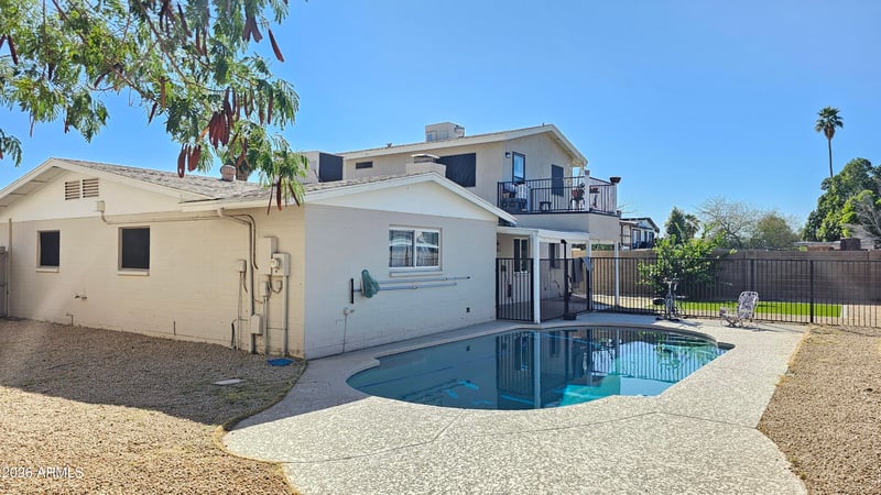 Listing details for 4518 Paradise Dr, Glendale, AZ 85304 : No HOA! Spacious and beautifully upgraded, this 6-bedroom, 3-bath home offers flexible living w/ a formal living room, family room & desirable first-floor primary suite. Recent upgrades include new carpet, luxury laminate flooring, tiled showers, modern vanities, sleek black fixtures, upgraded switches & outlets, designer lighting, ceiling fans & a stylish barn door accent. The updated kitchen features quartz countertops, custom backsplash, breakfast bar, large pantry, dining area, stainless steel appliances, & two stainless steel refrigerators. Enjoy an inside laundry room w/ washer and dryer, 6 closets including 3 walk-ins, 2-car garage, RV gate, private pool, second-story balcony, fruit trees, low-maintenance desert landscaping w/ automatic watering & a newer water heater.