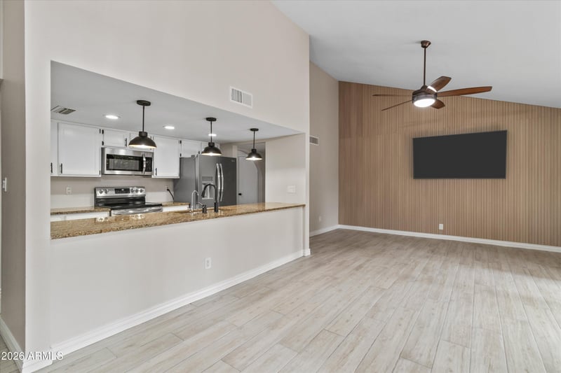 Inside, the split floor plan spans 2,109 square feet with four bedrooms and two bathrooms, creating flexibility for everyday living, hosting, or working from home. Tile flooring, a new neutral interior palette, and a custom living room accent wall give the home a clean, modern feel. Vaulted ceilings and multiple living and dining areas create an open, welcoming layout, while the centrally located kitchen with pantry flows seamlessly into both formal and casual spaces. The primary suite offers a walk-in closet and a private retreat complete with dual vanities and a walk-in tile shower. Three additional bedrooms provide flexibility for a home office, guest rooms, a growing family, or creative flex spaces to fit your lifestyle. A secondary bathroom with tasteful updates offers added comfort for guests.