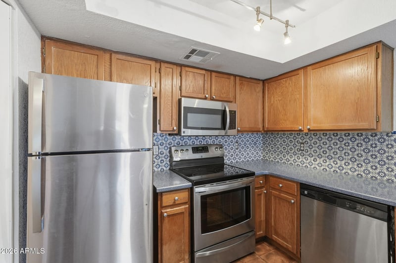 Listing details for 4545 67th Ave #2420, Phoenix, AZ 85033 : Welcome to a home that feels inviting from the moment you step inside. Located in a gated community, this well-maintained residence offers soaring ceilings and large windows that fill the space with natural light. The modern kitchen features upgraded appliances and beautiful countertops, perfect for everyday living or entertaining. Tile floors add style and durability, while the carpeted bedroom provides a cozy retreat. With easy access to highways, shopping, dining, and Grand Canyon University, this move-in ready home offers comfort, convenience, and exceptional value.