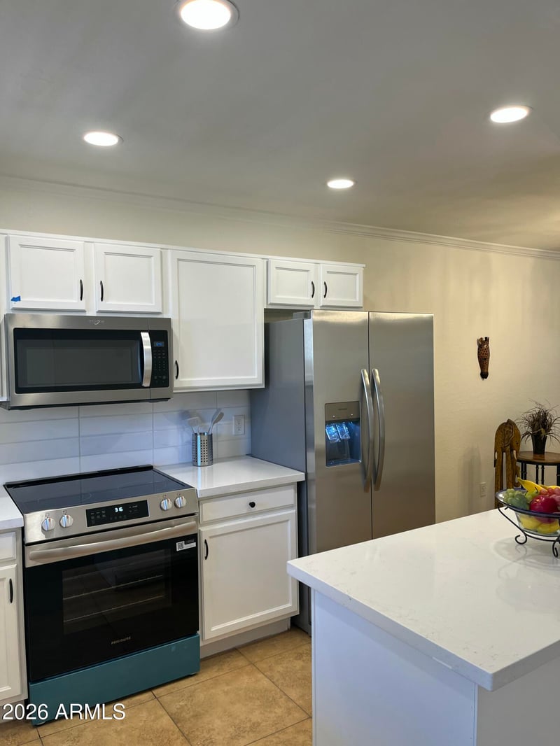 Listing details for 455 Mesa Dr #146, Mesa, AZ 85204 : Stunning and spacious! 2 bedroom townhouse in gated community! Step into a spacious great room that opens to a gorgeous kitchen with white cabinets, brand new quartz countertops and stainless appliances. All new fixtures and lighting makes this kitchen like new!