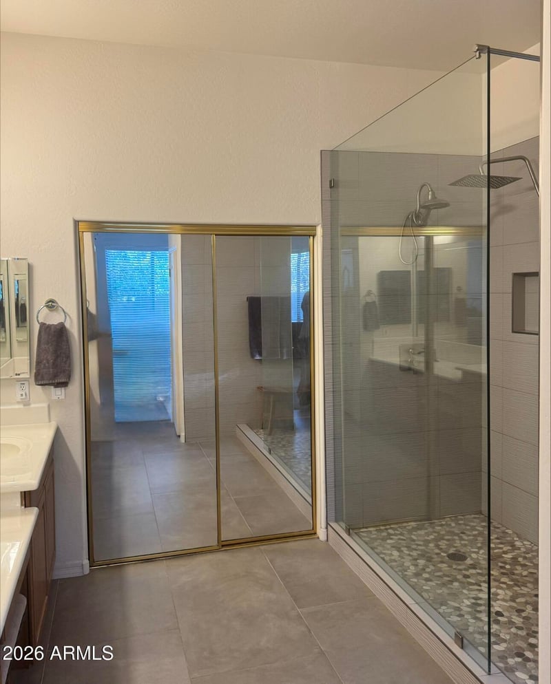 The main-floor master suite is a genuine retreat. Vaulted ceilings, direct backyard access through French doors, and a spa-quality bath featuring a walk-in frameless glass shower with rain head and pebble tile floor, dual built-in niches, glass block window flooding the space with natural light, dual vanity, and an oversized walk-in closet that rivals new construction at twice the price.