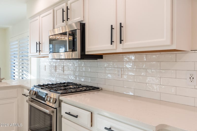 Listing details for 4558 Coyote Wash Dr, Cave Creek, AZ 85331 : Set within the gated community of Jasmine Trails in Dove Valley Ranch, this beautifully remodeled 1,504sf. two story home backs to open desert, offering privacy and sweeping desert views. Soaring two level high ceilings and expansive windows fill the freshly painted interior with natural light, creating a bright, welcoming atmosphere. The redesigned kitchen showcases quartz countertops and a suite of Bosch stainless steel appliances, including a gas range, along with updated lighting. Plantation shutters add timeless appeal, while porcelain tile floors extend through the main living areas with carpet only on the stairs. The primary suite features a spacious updated shower and a generous walk-in closet. Outside, a lush backyard, covered patio, and view fencing frame the desert beyond.