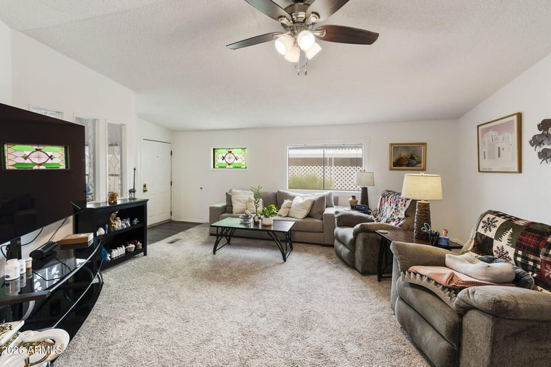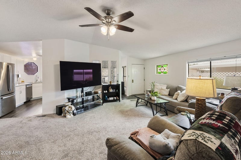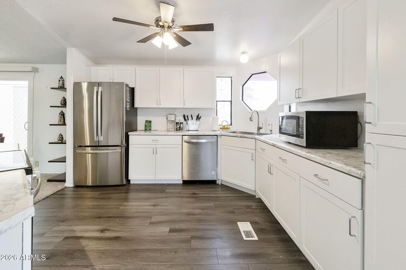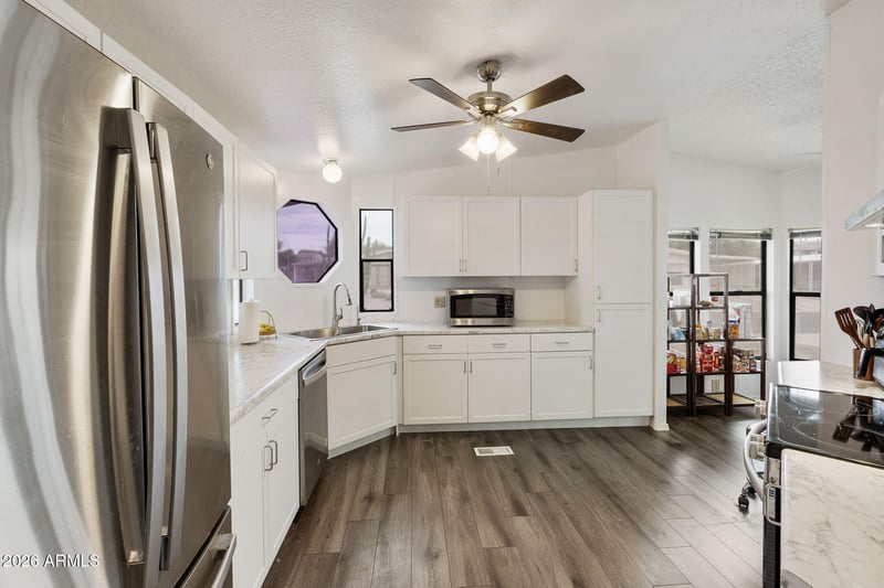 Listing details for 456 83rd Way, Mesa, AZ 85208 : Welcome to this home in the 55+ gated community of Fountain of the Sun. The home features a bright open floor plan with a breakfast nook and formal dining area that flows into the great room. The primary suite includes double vanities and a walk-in closet, and the guest bedroom also offers a walk-in closet. Interior updates include flooring (2025) and a remodeled kitchen (2024) with dishwasher, refrigerator, disposal, and built-in microwave. A spacious indoor laundry room includes additional office space. Major system updates include wiring (2022), plumbing (2026), HVAC (2018), and bathroom updates (2026). Washer and dryer are included. Outside, there is a covered patio and a workshop with AC, a window, and a sink. No land lease. Walk to the pool/spa, Activity Center, Birdie's Restaurant, and golf facilities. Ideally located near the US 60/Red Mountain Freeways for easy access to airports, Costco, and major shopping malls. Enjoy community amenities including a lake, golf course, pickleball, fitness center, and more.