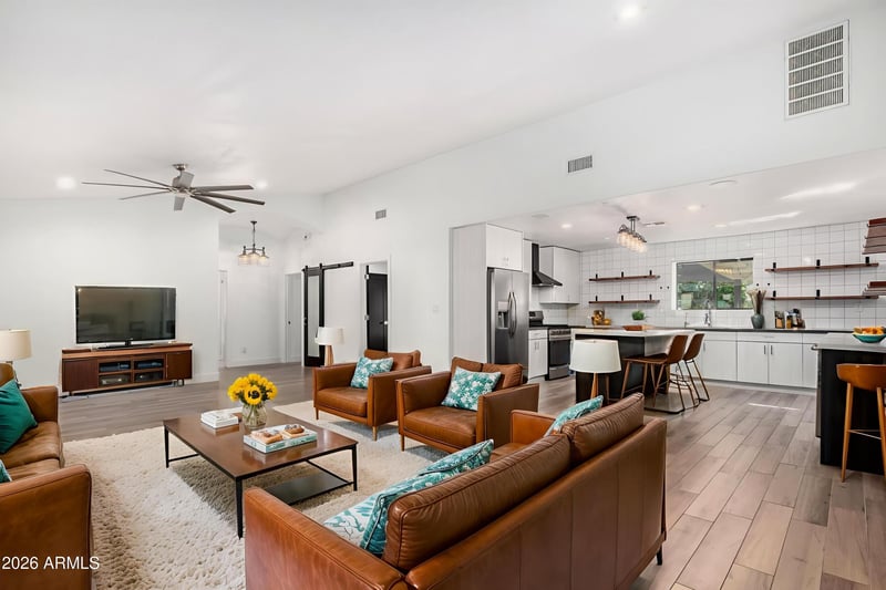 Listing details for 4607 Edgemont Ave, Phoenix, AZ 85008 : Located in the highly desirable Arcadia Lite District, this single-level ranch-style home sits on an approx. 1/4-acre flood-irrigated lot with no HOA and easy access to Sky Harbor Airport, top schools, dining, and major freeways.This 4-bedroom, 3-bath home offers a bright, open floor plan with vaulted ceilings, wood-look tile flooring, neutral finishes, and updated lighting throughout. The chef's kitchen features quartz countertops, stainless steel appliances, gas range, wine fridge, custom tile backsplash, 42'' European-style cabinetry, recessed lighting, a pantry, and a large center island with breakfast bar seating.