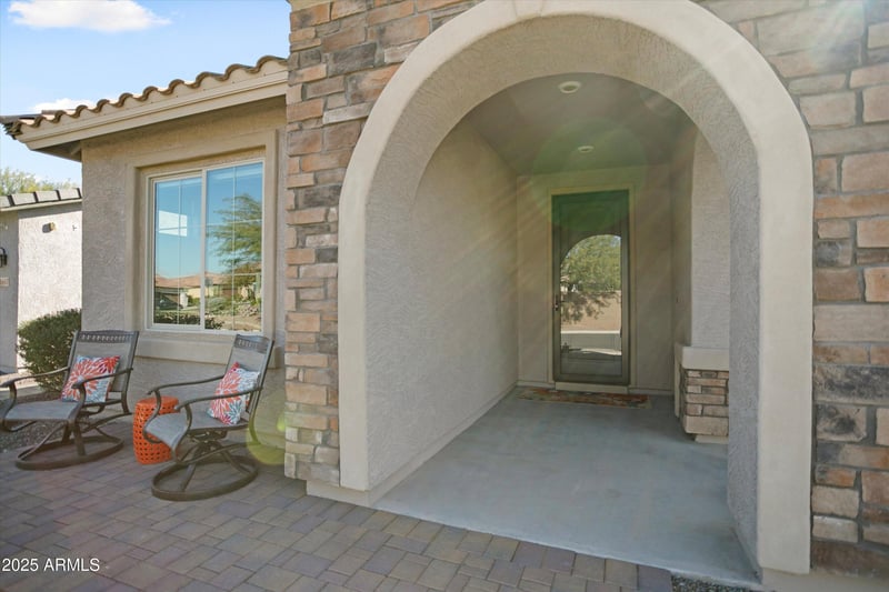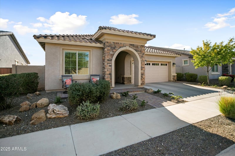 Listing details for 4663 204th Ave, Buckeye, AZ 85396 : Located in the vibrant 55+ active adult community of Victory at Verrado, this beautifully upgraded single-story residence offers a perfect blend of comfort and modern living. As you enter, you'll find two spacious bedrooms at the front, complete with an adjacent full bathroom, providing privacy and convenience for guests or family. This home boasts three bedrooms and two baths, providing ample space for family and visitors. The pavers the sidewalk and front porch enhance the curb appeal, while the travertine back patio offers a luxurious outdoor living space for entertaining or unwinding. The heart of the home is the inviting main living area, seamlessly connected to a charming back patio, perfect for enjoying Arizona's stunning sunsets. The owner's suite is thoughtfully designed for relaxation and comfort, featuring ample closet space and a tranquil atmosphere that connects to the laundry room for convenience. The kitchen is a chef's delight, fully equipped with stainless steel appliances, upgraded cabinets, and stunning countertops. With partial mountain views visible through the view fencing, the landscaped front and backyard create a picturesque setting to enjoy the beautiful Arizona weather.