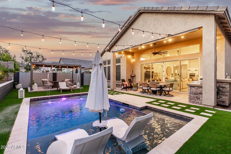 Experience resort-style living in this stunning single-level model home located in a private gated community within the award-winning Verrado master-planned community in Buckeye, Arizona. Designed with 12-foot ceilings and custom finishes throughout, this home offers an open-concept layout featuring a chef's kitchen, large center island, and an expansive great room, perfect for entertaining or everyday living. The split floor plan provides comfort and privacy, while every detail showcases exceptional craftsmanship and modern design. Step outside to your resort-inspired backyard complete with a sparkling pool, custom pergola, covered patio, and breathtaking mountain views. Located in the heart of Verrado, residents enjoy access to dozens of parks, miles of hiking and biking trails, two golf courses, top-rated schools, and the charming Main Street district with dining, shops, and community events. If you're searching for a luxury home for sale in Verrado with mountain views, a pool, and gated privacy, this designer retreat offers the perfect blend of sophistication, space, and Arizona lifestyle.